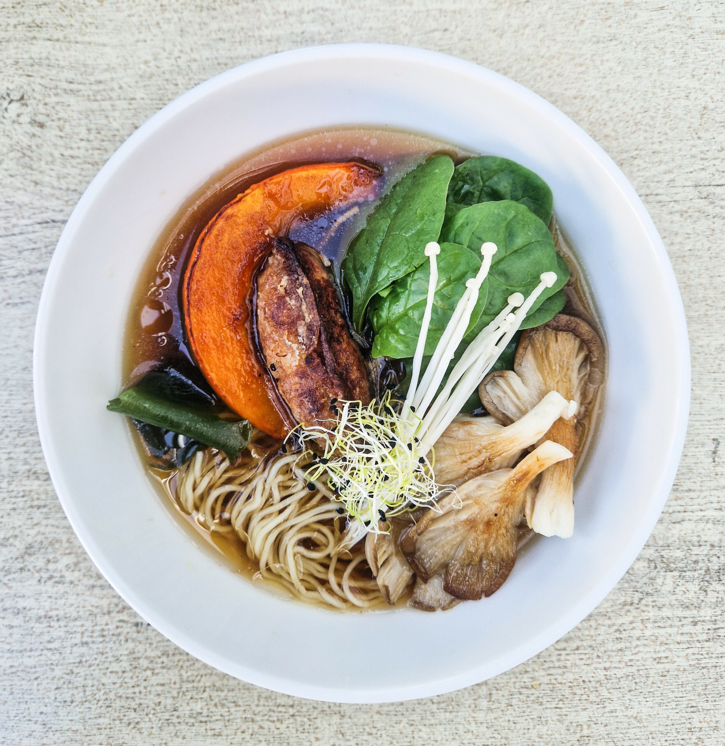 Magret de canard du Sud-Ouest, bouillon maison au soja mijoté des heures, infusé au pa-lo, huile d’ail brûlé, Poêlée de pleurotes, Champignons enoki, Cébette et ciboulette thaï. Nouilles ramen, en option nouilles udon ou nouilles de riz.