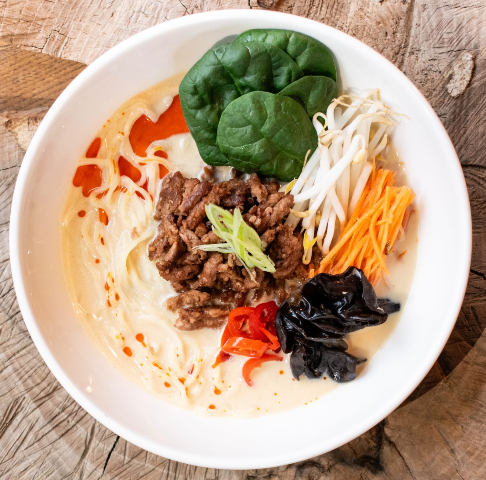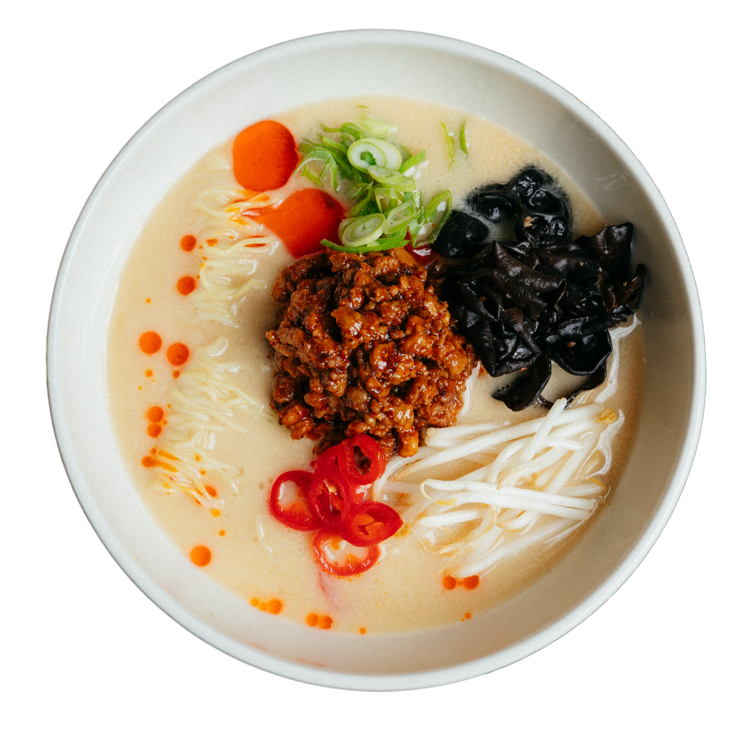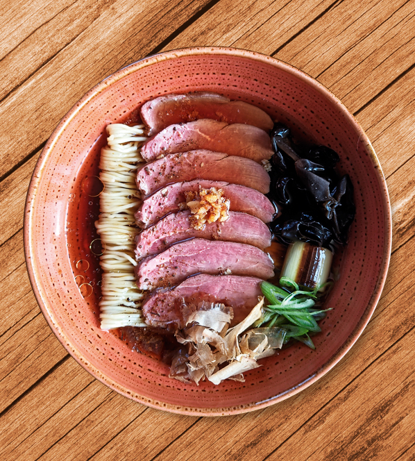 Bouillon shoyu maison à l'ail noir et réhaussé par une touche d'huile à l'ail brûlé Canard du sud ouest cuit en basse température Kikurage (champignons japonais) sautés, poireaux marinés, cébette croquante et katsuobushi (bonite séchée) aux notes d'umami Servi avec nouilles ramen, en option nouilles de riz ou udon